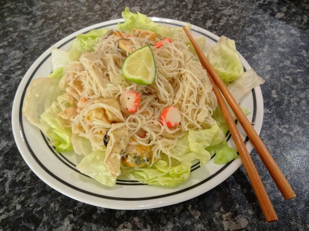 Basically it's rice vermicelli stir-fried with onions, mushrooms, prawns, seafood sticks and mussels. Threw in some egg at the end as well. All in all it only took about 30 minutes of preparation and cooking time (not counting defrosting the seafood of course). It was great! Next time I'll probably add some garlic and squeeze some lime over it as well.
